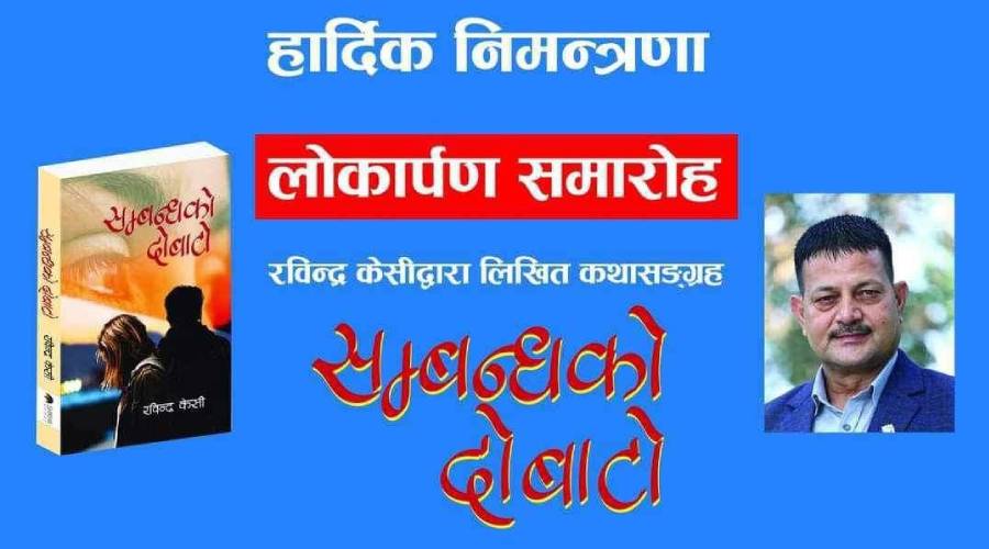 काठमाडौं । रविन्द्र केसीद्धारा लिखित कथासंग्रह पुस्तक ‘सम्बन्धको दोबाटो’ विमोचन हुने भएको छ । पुस १४ गते (शनिबार) प्रहरी महानिरीक्षक (आईजीपी) बसन्त बहादुर कुँवरको प्रमुख आतिथ्यमा पुस्तक विमोचन हुने भएको हो ।