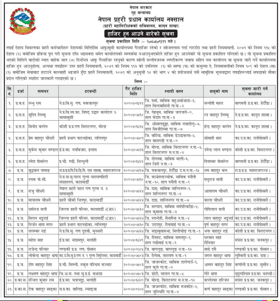 काठमाडौं । नेपाल प्रहरीले गैर हाजिर रहेका २१ प्रहरीलाई सात दिने समयसीमा दिएर सम्पर्कमा आउन निर्देशन दिएको छ ।