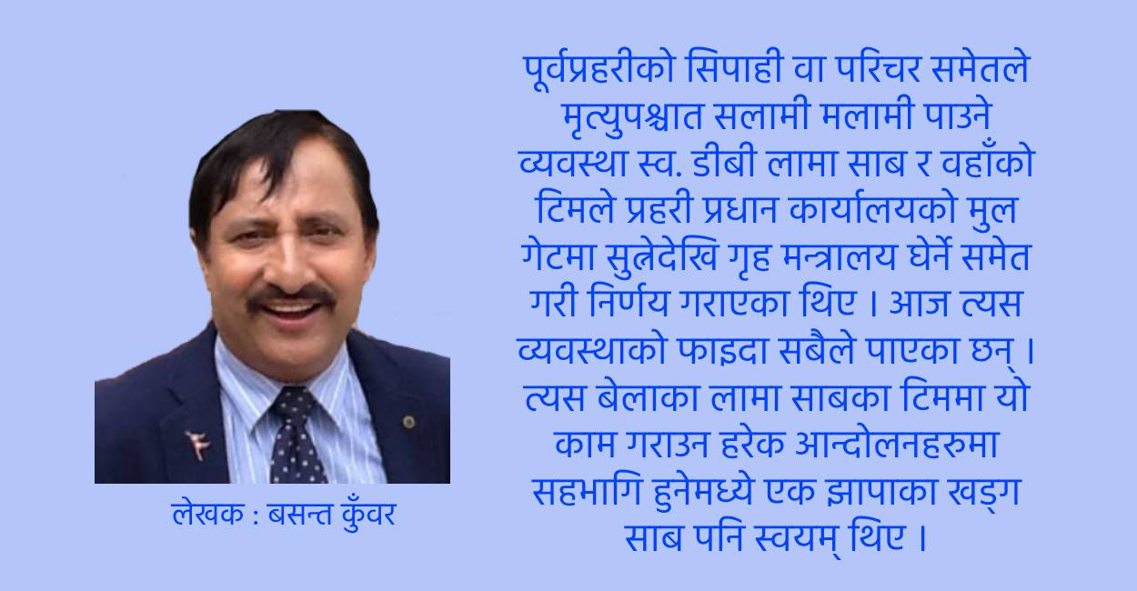 पूर्वप्रहरीको सिपाही वा परिचर समेतले मृत्युपश्चात सलामी मलामी पाउने व्यवस्था स्व. डीबी लामा साब र वहाँको टिमले प्रहरी प्रधान कार्यालयको मुल गेटमा सुत्नेदेखि गृह मन्त्रालय घेर्ने समेत गरी निर्णय गराएका थिए । आज त्यस व्यवस्थाको फाइदा सबैले पाएका छन् ।