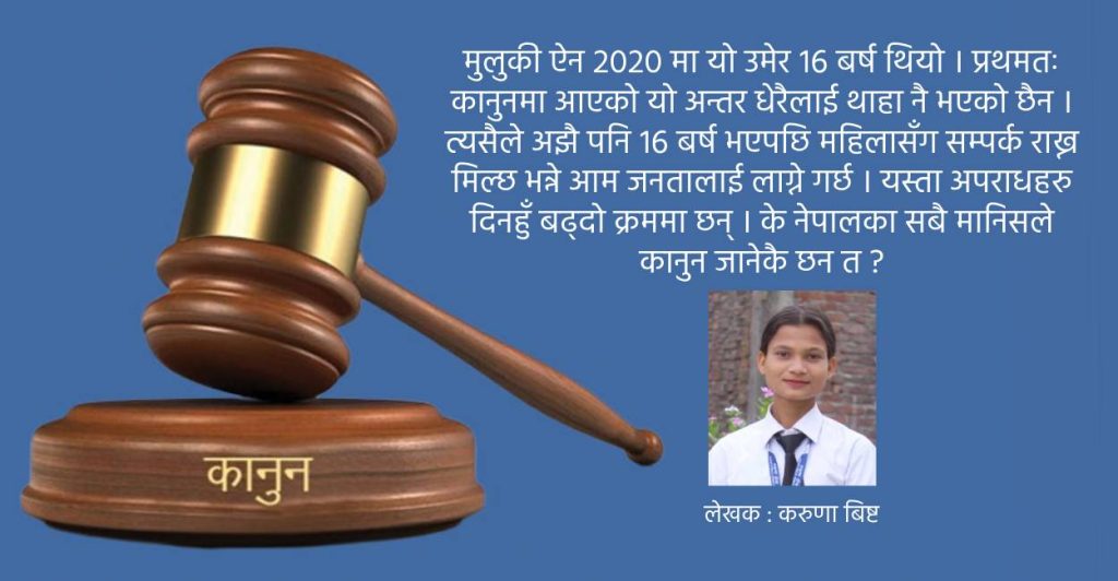 मुलुकी ऐन २०२० मा यो उमेर १६ बर्ष थियो । प्रथमतः कानुनमा आएको यो अन्तर धेरैलाई थाहा नै भएको छैन । त्यसैले अझै पनि १६ बर्ष भएपछि महिलासँग सम्पर्क राख्न मिल्छ भन्ने आम जनतालाई लाग्ने गर्छ । यस्ता अपराधहरु दिनहुँ बढ्दो क्रममा छन् । के नेपालका सबै मानिसले कानुन जानेकै छन त ?