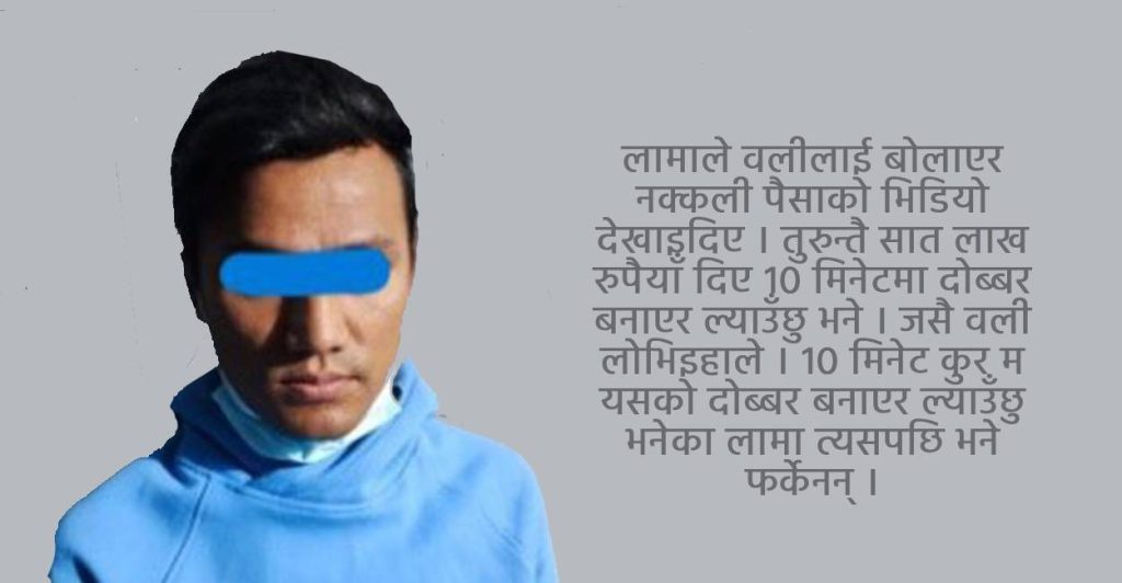 तुरुन्तै सात लाख रुपैयाँ दिए १० मिनेटमा दोब्बर बनाएर ल्याउँछु भने । जसै वली लोभिइहाले । ‘१० मिनेट कुर म यसको दोब्बर बनाएर ल्याउँछु भनेका लामा त्यसपछि भने फर्केनन् ।