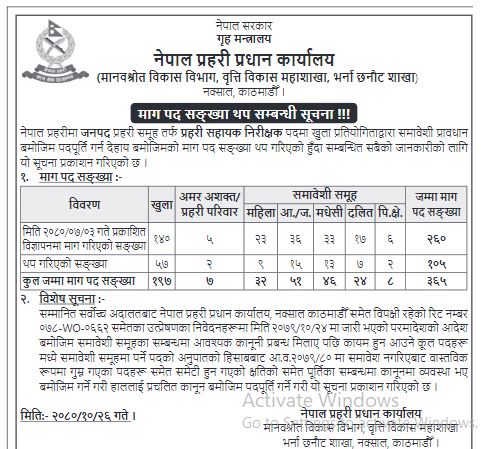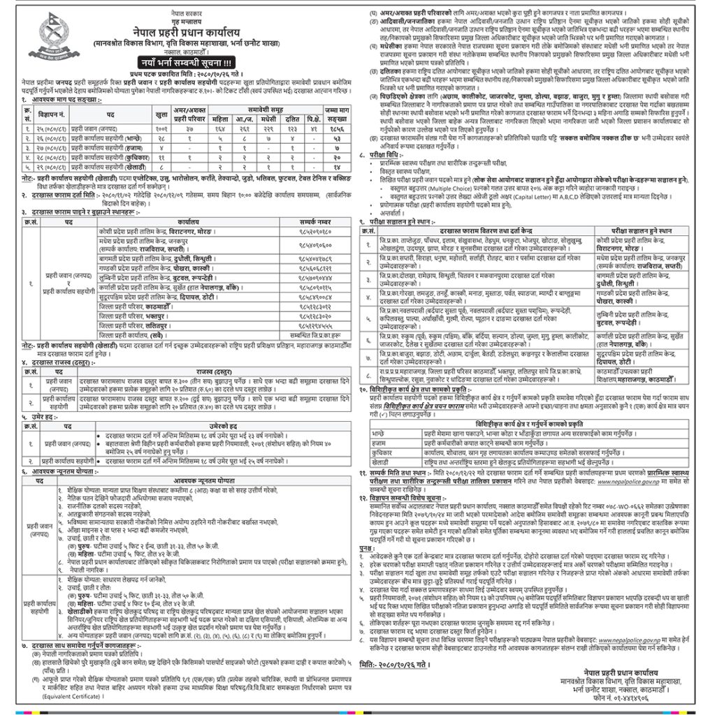 काठमाडौं । नेपाल प्रहरीले ठूलो संख्यामा रिक्त पदपूर्तिका लागि आवेदन मागेको छ । प्रहरी प्रधान कार्यालयले जनपद प्रहरी समूहतर्फ रिक्त प्रहरी जवान र प्रहरी कार्यालय सहयोगी पदहरूमा दरखास्त माग गरेको हो ।