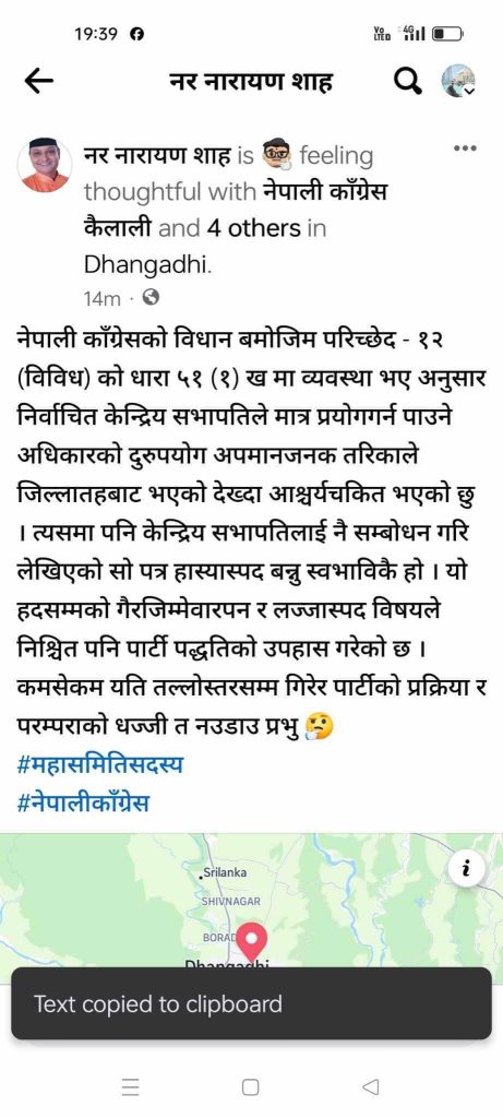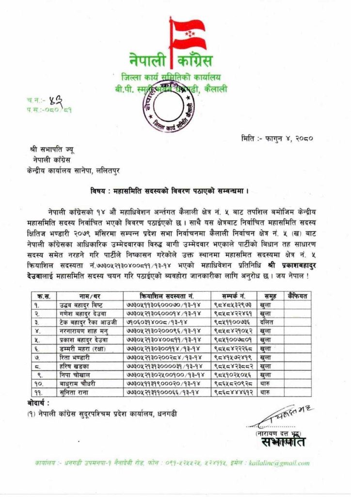 ७७ जिल्लामा कसैलाई यसरी मनपरी महासमिति चयन गर्ने छुट नभएको महामन्त्री गगन कुमार थापा र विश्वप्रकाश शर्माले बताइरहेको बेला मन्त्री प्रकाश देउवाकै निर्देशनमा जिल्ला सभापतिले खुल्लमखुल्ला विधानको धज्जी उडाएको चर्चा छ ।
