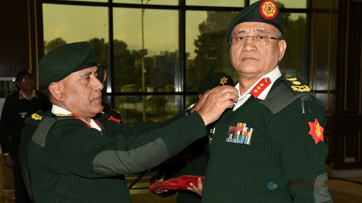 काठमाडौं । नेपाली सेनाका उपरथी निर्मलकुमार थापाले मंगलबार दर्ज्यानी चिन्ह लगाएका छन् । उनलाई प्रधानसेनापति प्रभुराम शर्माले एक समारोहबीच रथीको दर्ज्यानी चिन्ह प्रदान गरेका हुन् ।
