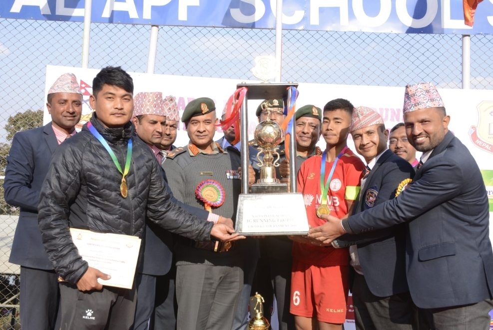 काठमाडौ । कीर्तिपुर नगरपलिका-४ स्थित नेपाल एपीएफ स्कुलको १९औं स्थापना दिवसका अवसरमा सञ्चालित प्रथम अन्तर विद्यालय सशस्त्र प्रहरी महानिरीक्षक (आईजीपी) रनिङ ट्रफी फुटबल प्रतियोगिताको उपाधि काभ्रेको साँगास्थित नेपाल पुलिस स्कुलले जितेको छ ।