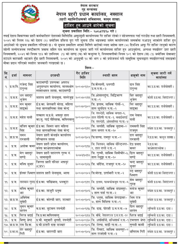 अन्यथा सेवाबाट हटाइने प्रहरी प्रधान कार्यालयले चेतावनी समेत दिएको छ । गैरहाजिर भएकाहरुमा प्रहरी सहायक निरीक्षक (असई) गजेन्द्र सिंह ठगुन्ना लगायतका छन् ।