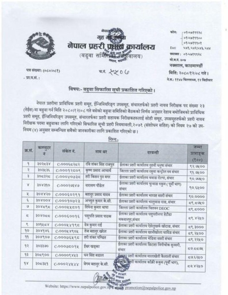 प्राविधिक प्रहरी समूह, इन्जिनियरिङ उपसमूह, सञ्चारतर्फका सहायक निरीक्षकहरुलाई सोही समूहको नायव निरीक्षकमा बढुवा सिफारिस गरिएको प्रधान कार्यालयले जनाएको छ ।