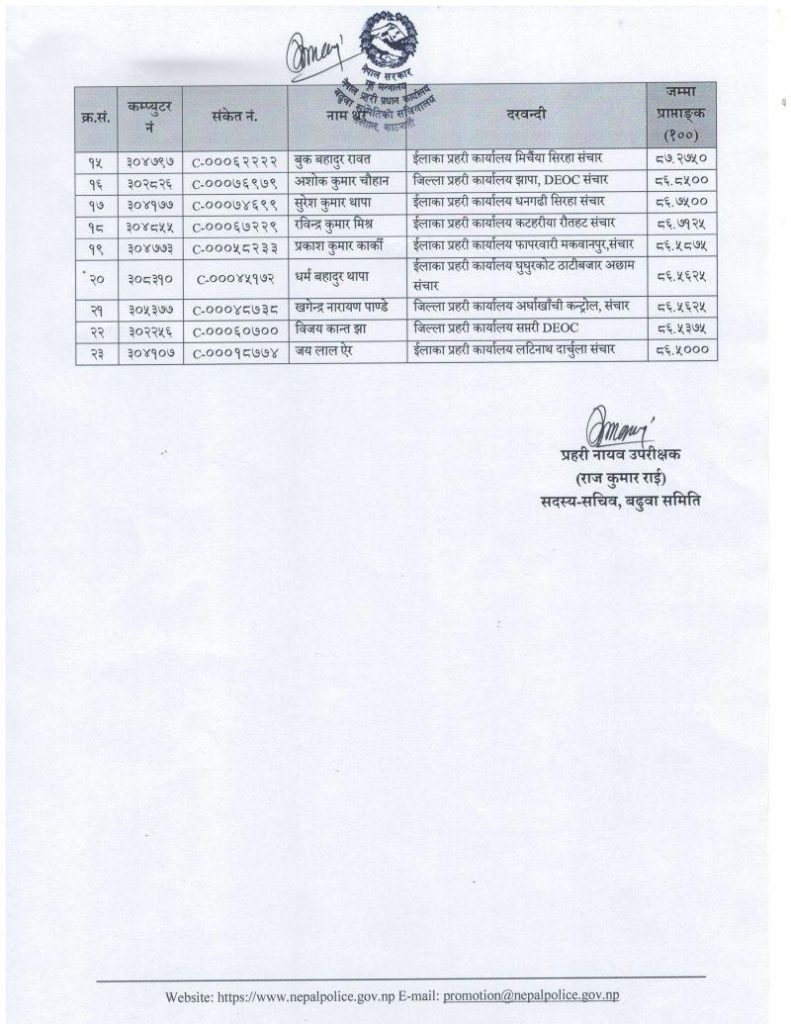 काठमाडौं । नेपाल प्रहरीका २३ जना प्रहरी सहायक निरीक्षक (असई) प्रहरी नायव निरीक्षक (सई) मा बढुवा सिफारिस भएका छन् ।