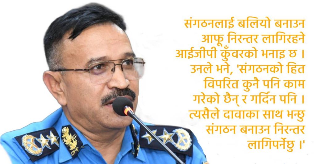 संगठनलाई बलियो बनाउन आफू निरन्तर लागिरहने आईजीपी कुँवरको भनाइ छ । उनले भने, ‘संगठनको हित विपरित कुनै पनि काम गरेको छैन् र गर्दिन पनि । त्यसैले दावाका साथ भन्छु संगठन बनाउन निरन्तर लागिपर्नेछु ।’