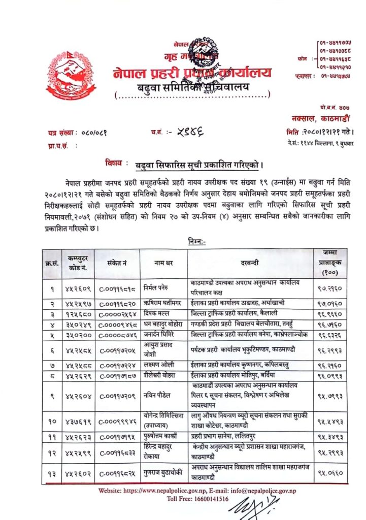 काठमाडौ । प्रहरी प्रधान कार्यालयले १९ जना प्रहरी निरीक्षक (इन्स्पेक्टर) लाई नायब उपरीक्षक (डीएसपी) मा बढुवा सिफारिस गरेको छ ।