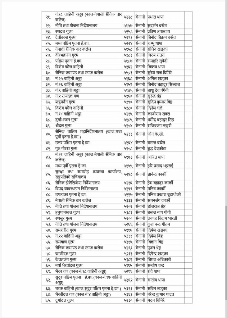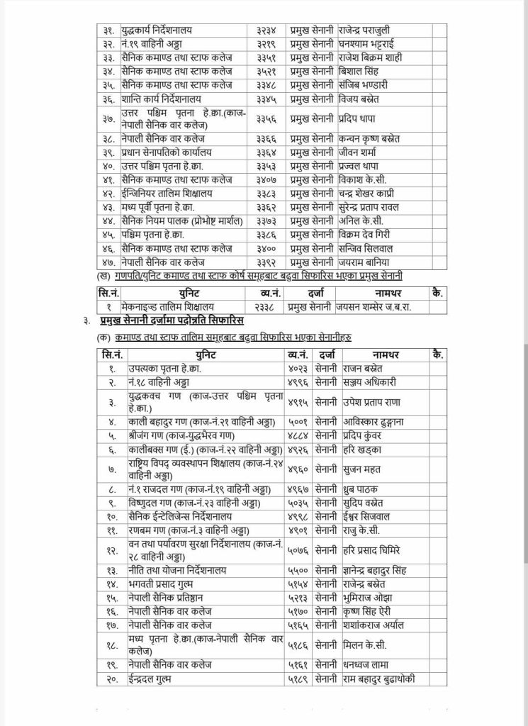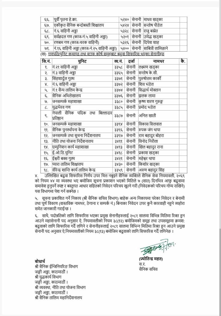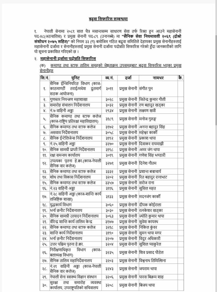 उनीहरुको रिक्त स्थानमा बढुवा हुने सेनाले जनाएको छ । प्रधानसेनापति प्रभुराम शर्माले बढुवा समितिले गरेको सैनिक अधिकृतहरुको बढुवा सदर गरेका हुन् ।
