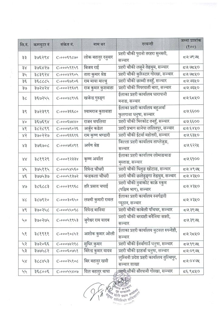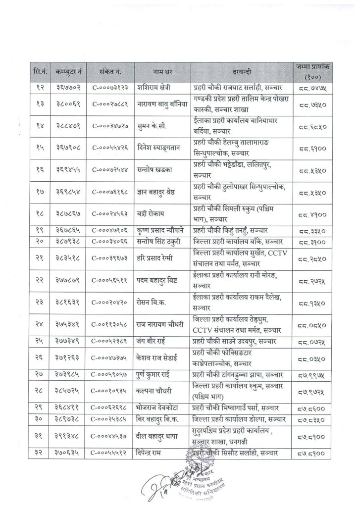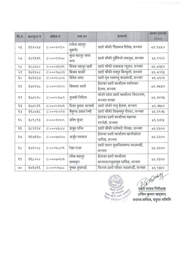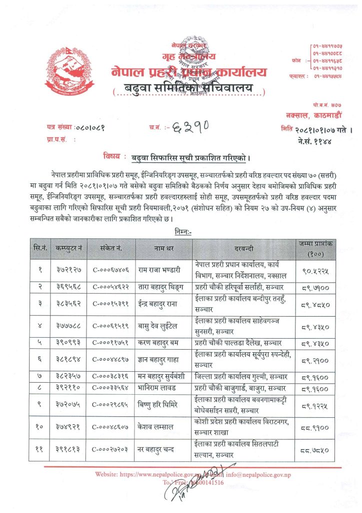 प्रहरी नियमावली २०७१ (संशोधनसहित) को नियम २७ को उप-नियम (४) बमोजिम ज्येष्ठताको आधारमा सोही समूहतर्फ बरिष्ठ हवल्दार पदमा बढुवाका लागि सिफरिस गरिएको प्रहरी प्रधान कार्यालयले जनाएको छ ।