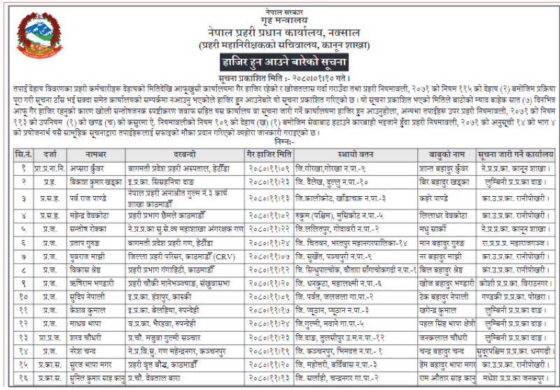 प्रहरी प्रधान कार्यालयका अनुसार २०८० फागुन २ गतेदेखि फागुन २४ गतेसम्म प्रहरी हवल्दार, जवान लगायत पदमा कार्यरत उनीहरु आफूखुसी कार्यालयमा गैरहाजिर भएका हुन् ।