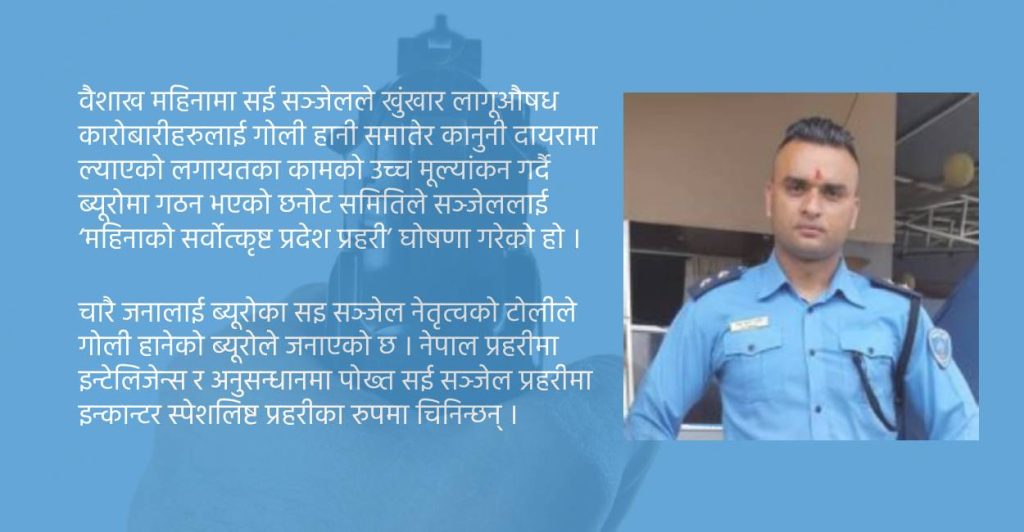 काठमाडौं । लागूऔषध नियन्त्रण ब्यूरो, कोटेश्वरमा कार्यरत प्रहरी बरिष्ठ नायब निरीक्षक (सई) बालकृष्ण सञ्जेल वैशाख महिनाको सर्वोत्कृष्ट प्रहरी घोषित हुन सफल भएका छन् ।