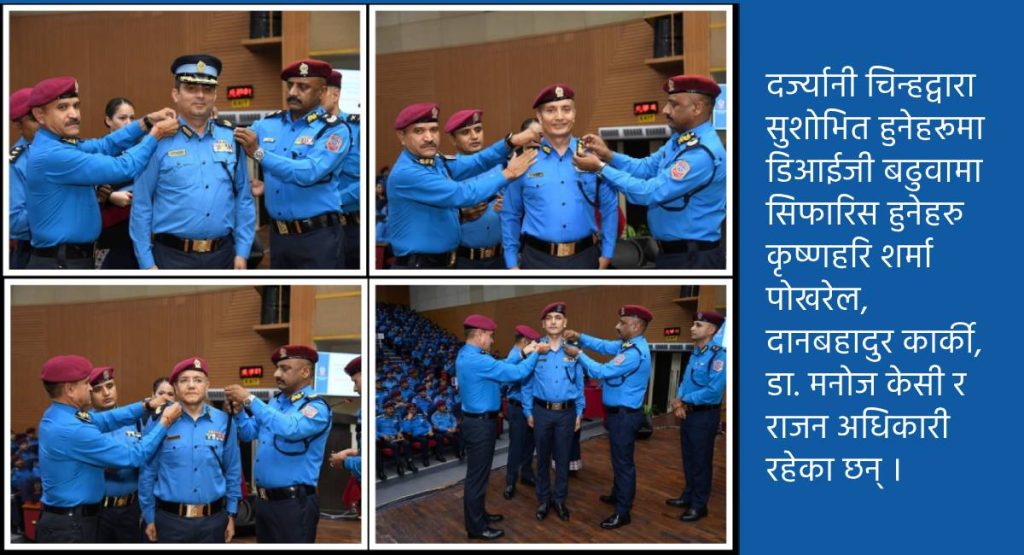 काठमाडौं । प्रहरी महानिरीक्षक (आईजीपी) बसन्त बहादुर कुँवरले हालै पदोन्नति भएका ४ जना प्रहरी अधिकृतहरूलाई दर्ज्यानी चिन्हद्वारा सुशोभित गरेका छन् ।