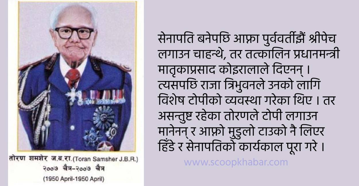 त्यसपछि राजा त्रिभुवनले उनको लागि विशेष टोपीको व्यवस्था गरेका थिए । तर असन्तुष्ट रहेका तोरणले टोपी लगाउन मानेनन् र आफ्नो मुडुलो टाउको नै लिएर हिँडे र सेनापतिको कार्यकाल पूरा गरे ।