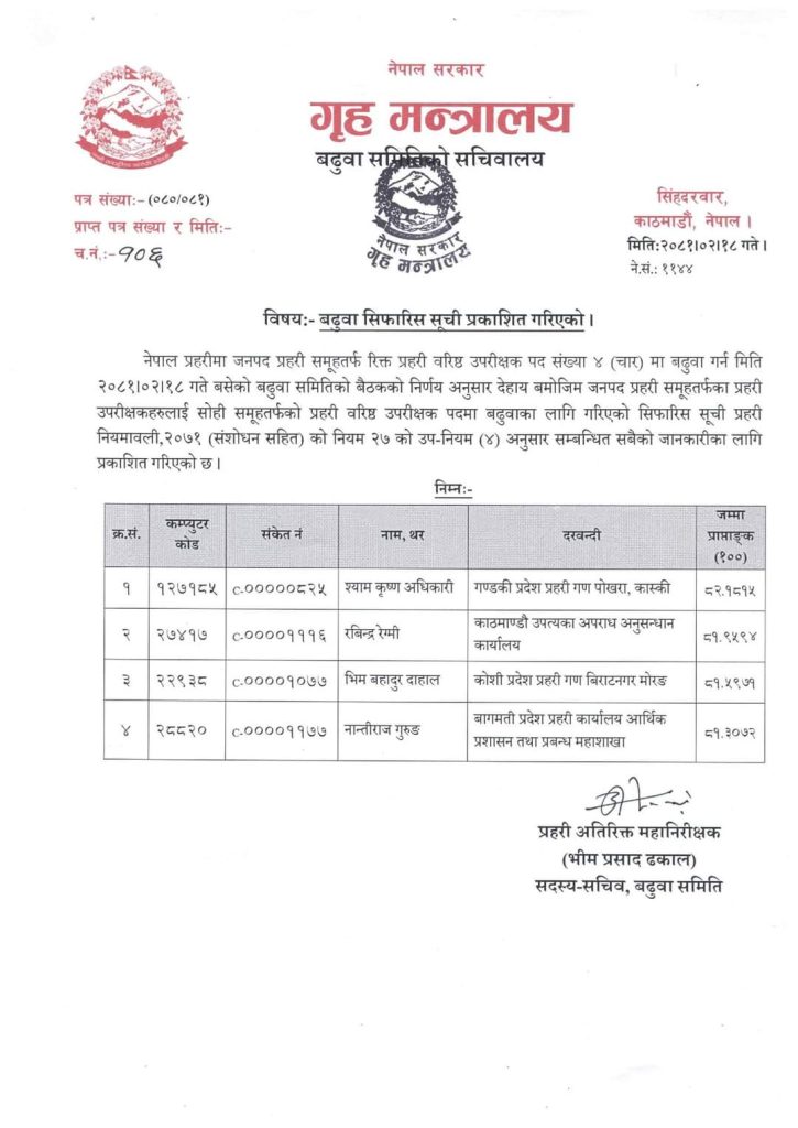 बढुवा समितिको बैठकले शुक्रबार राती एसपीलाई रिक्त एसएसपी र डिएसपीलाई एसपी पदमा बढुवाका लागि सिफारिस गर्ने निर्णय गरेको हो ।