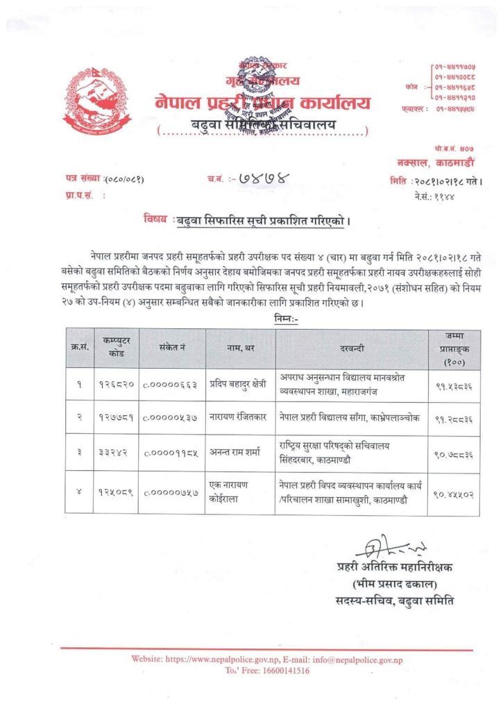 काठमाडौ । प्रहरी प्रधान कार्यालयले ४ जना प्रहरी उपरीक्षक (एसपी) प्रहरी वरिष्ठ उपरीक्षक(एसएसपी) मा र ४ जना प्रहरी नायब उपरीक्षक (डिएसपी) एसपी बढुवाका लागि सिफारिस भएका छन् ।