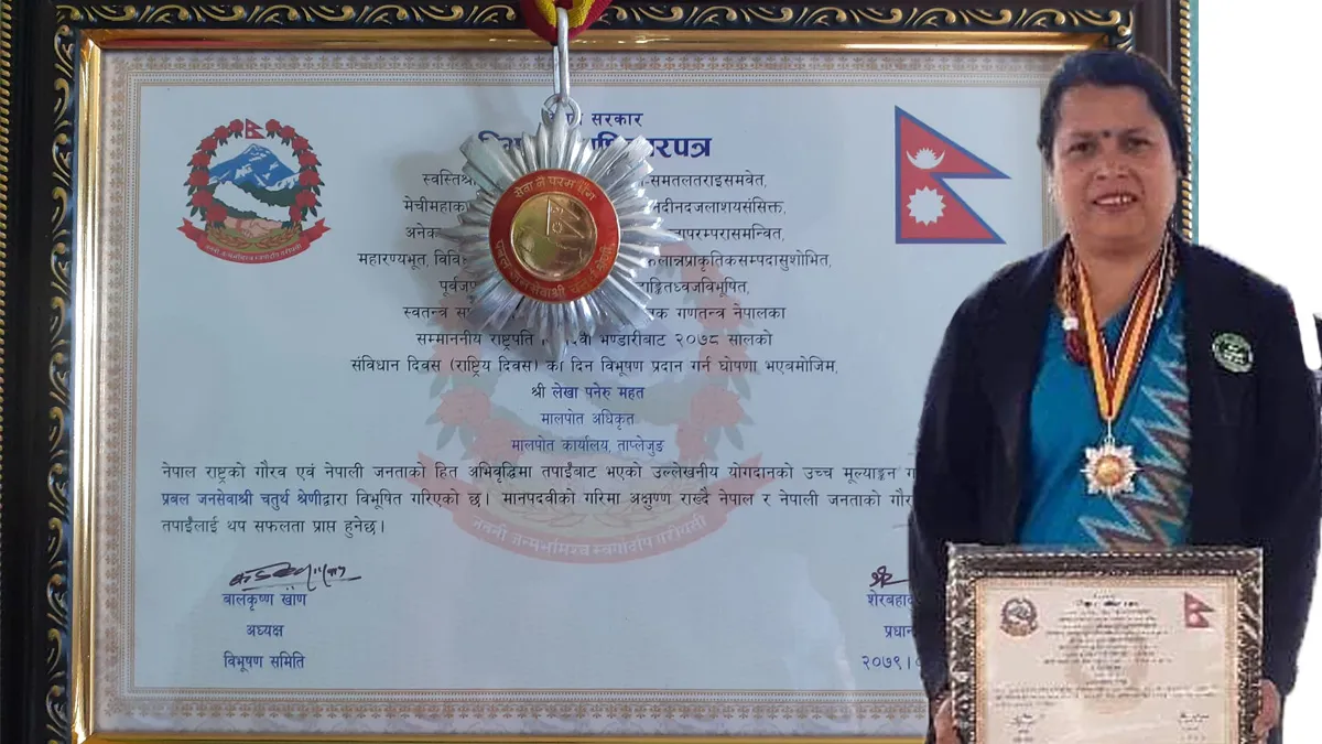 महतले घुससहित रंगेहात पक्राउ पर्नुभन्दा १० दिनअघि मात्र सरकारबाट पदक पाएकी थिइन् । १ वैशाख ०७९ मा उनलाई भूमि व्यवस्था, सहकारी तथा गरिबी निवारण मन्त्रालयको सिफारिसमा प्रवल जनसेवाश्री पदक प्रदान गरिएको थियो।