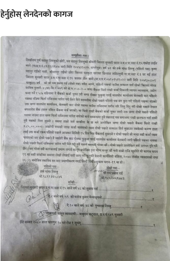 धरान–१५ कि हर्कमाया लिम्बुको हाल सुन्दर हरैंचा नगरपालिका तत्कालिन दुलारी गाविसमा रहेको ८ कट्ठा २ धुर जग्गा बैंकमा राखी ८५ लाख रुपैंया ऋण लिने लेनदेनको विषयमा अनाहकमा रामप्रसाद राईमाथि दबाब दिइएको बताइएको छ ।