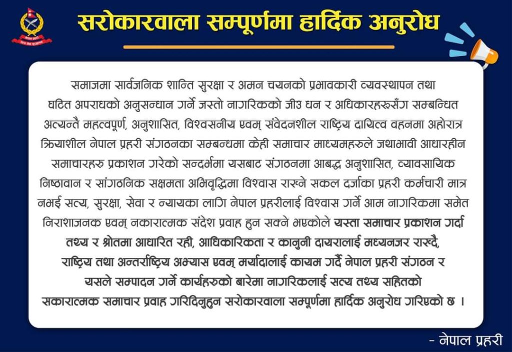 साथै समाचार लेख्दा कानुनी दायरलाई मध्यनजर राख्न समेत प्रहरीले आग्रह गरेको छ ।