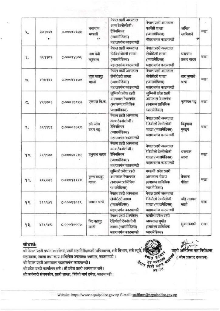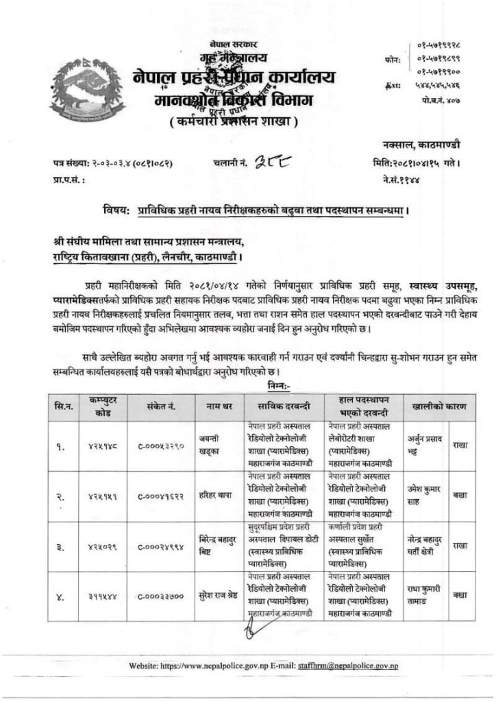 साथै उनीहरुको पदस्थापन पनि गरिएको प्रहरी प्रधान कार्यालयले जनाएको छ । उनीहरुलाई प्रचलित नियमानुसार तलव, भत्ता तथा राशन समेत हाल पदस्थापन भएको दरवन्दीबाट पाउने गरी पदस्थापन गरिएको बताइएको छ ।