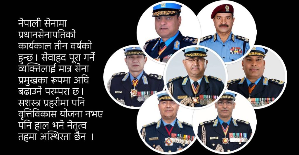 देशका अन्य सुरक्षा निकायमा तुलनात्मक रूपमा यस्तो अस्थिरता छैन । नेपाली सेनामा प्रधानसेनापतिको कार्यकाल तीन वर्षको हुन्छ । सेवाहद पूरा गर्ने व्यक्तिलाई मात्र सेना प्रमुखका रूपमा अघि बढाउने परम्परा छ ।
