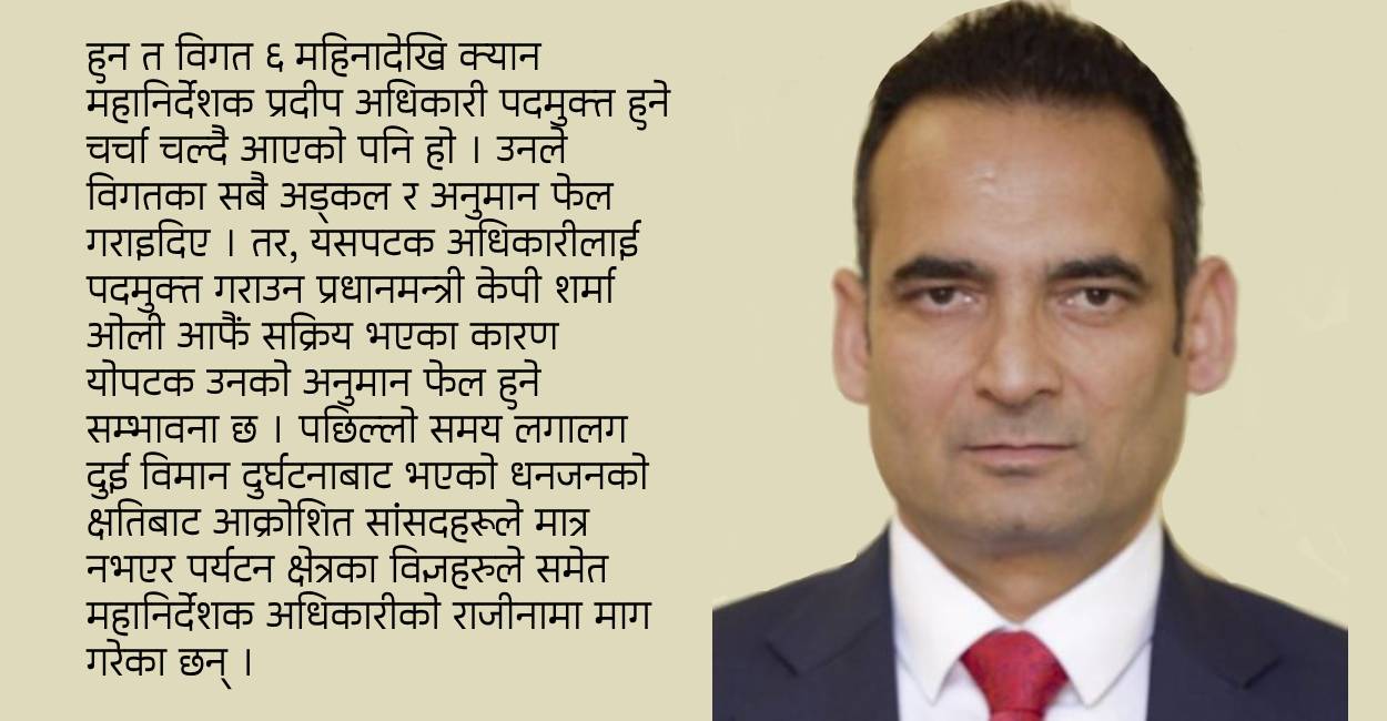 पछिल्लो समय लगालग दुई विमान दुर्घटनाबाट भएको धनजनको क्षतिबाट आक्रोशित सांसदहरूले मात्र नभएर पर्यटन क्षेत्रका विज्ञहरुले समेत महानिर्देशक अधिकारीको राजीनामा माग गरेका छन् । महानिर्देशक अधिकारीलाई हटाउने संकेत गरेपछि पर्यटन क्षेत्रमा समेत खुसीयाली छाएको छ ।