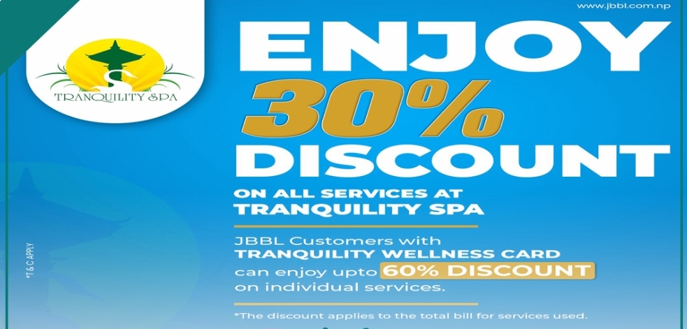 काठमाडौं । ज्योति विकास बैंक लिमिटेडले काठमाडौंस्थित प्रचलित “ Tranquility Spa” मा बैंकका ग्राहकहरूलाई ३०% सम्मको विशेष छुट प्रदान गर्ने सम्बन्धी सम्झौता गरेको छ।