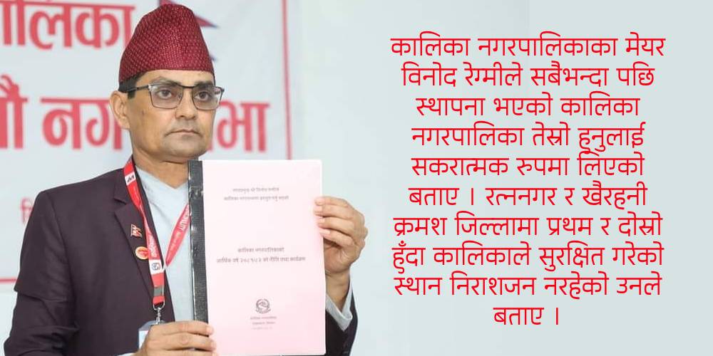 रत्ननगर र खैरहनी क्रमश जिल्लामा प्रथम र दोस्रो हुँदा कालिकाले सुरक्षित गरेको स्थान निराशजन नरहेको उनले बताए । लिजालाई चाहिने फोहोर व्यवस्थापन लगायत अन्य काम गर्ने तयारीमा रहेको भन्दै उनले तोकिएको सुचकहरु पुरा गरी अहिलेको नतिजाले उत्साहित हुँदै आगामी आर्थिक बर्षमा पहिलो र दोस्रो हुने प्रयास गर्ने बताए ।