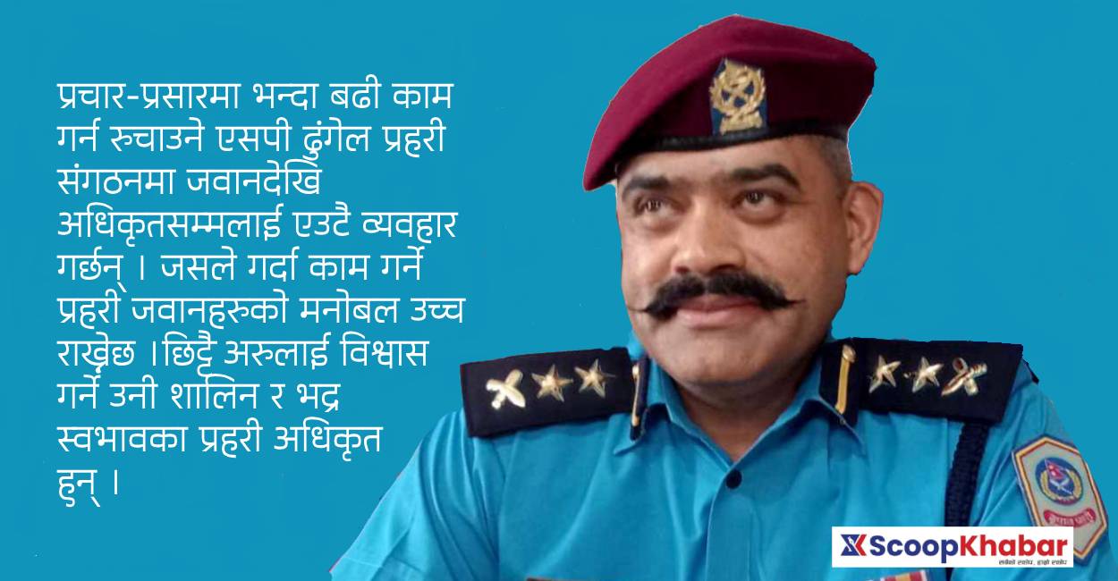 काम र एक्सनमा बिश्वास गर्ने उनी प्रचार-प्रसार र मिडियामा भने कमै मात्रमा छाउँछन् । प्रचार-प्रसारमा भन्दा बढी काम गर्न रुचाउने एसपी ढुंगेल प्रहरी संगठनमा जवानदेखि अधिकृतसम्मलाई एउटै व्यवहार गर्छन् । जसले गर्दा काम गर्ने प्रहरी जवानहरुको मनोबल उच्च राख्नेछ ।
