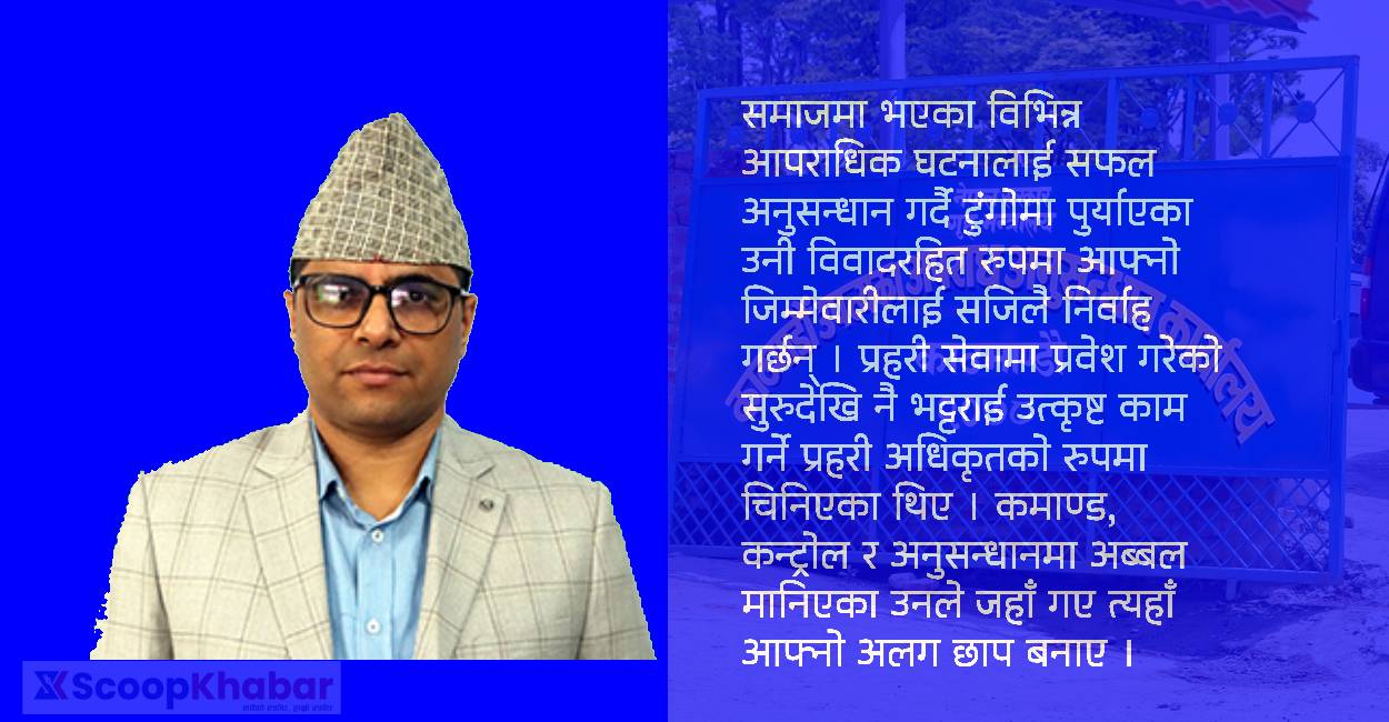 अपराध नियन्त्रण, अनुसन्धानमा अब्बल दरिएका उनी आर्थिकदेखि लिएर कुनै पनि विवादमा नमुछिएका प्रहरी अधिकृत हुन् । समाजमा भएका विभिन्न आपराधिक घटनालाई सफल अनुसन्धान गर्दै टुंगोमा पुर्याएका उनी विवादरहित रुपमा आफ्नो जिम्मेवारीलाई सजिलै निर्वाह गर्छन् ।