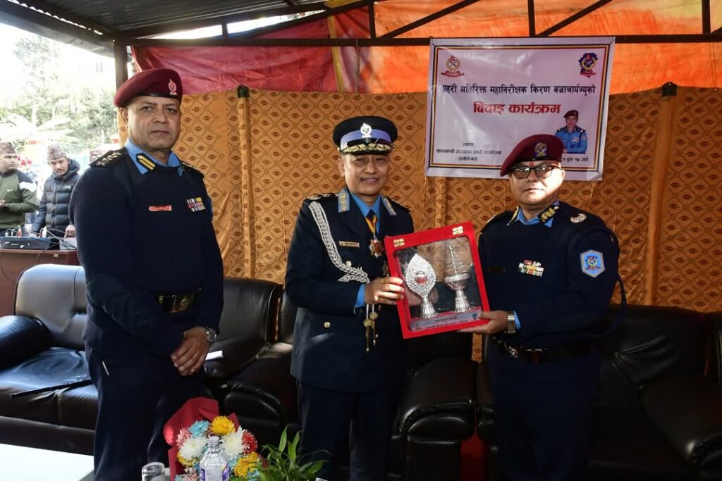 काठमाडौं । उपत्यका प्रहरी प्रमुख अतिरिक्त महानिरीक्षक (एआईजी) किरण बज्राचार्यको बिदाइ गरिएको छ । मंगलबारदेखि ५६ वर्षे उमेर हदका कारण अनिवार्य अवकाशमा जान लागेकी बज्राचार्यलाई सोमबार बिदाइ गरिएको छ ।