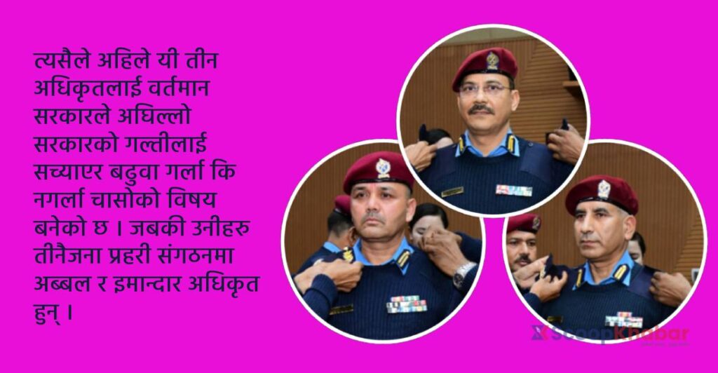 त्यसैले अहिले यी तीन अधिकृतलाई वर्तमान सरकारले अघिल्लो सरकारको गल्तीलाई सच्याएर बढुवा गर्ला कि नगर्ला चासोको विषय बनेको छ । जबकी उनीहरु तीनैजना प्रहरी संगठनमा अब्बल र इमान्दार अधिकृत हुन् ।