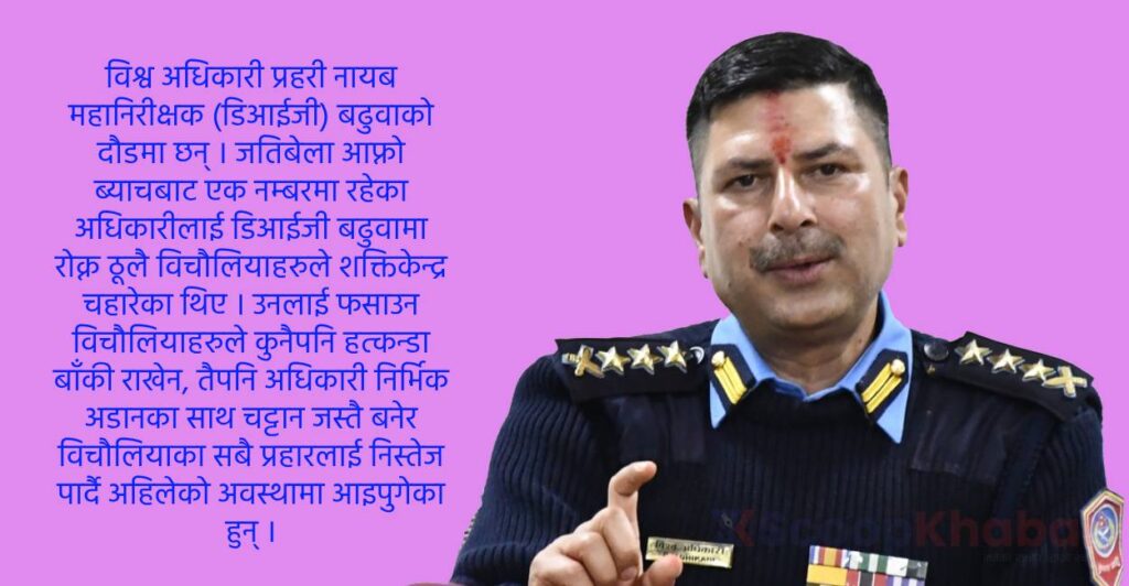 हाल प्रहरी संगठनमा १० वटा डिआईजी पद रिक्त छ । जसको लागि २ दर्जन बढी एसएसपीहरु प्रतिस्पर्धामा छन् । त्यसमध्येका एक हुन् एसएसपी अधिकारी । आफ्नो ब्याचबाट एक नम्बरमा रहेका अधिकारीलाई डिआईजी बढुवामा अगाडि ल्याउन प्रहरी नेतृत्वसमेत सकारात्मक रहेको स्रोत बताउँछ ।