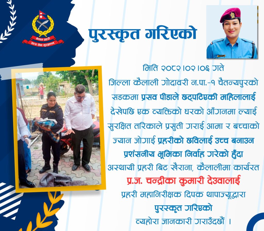 चन्द्रिकाले आमा र बच्चाको ज्यान जोगाई प्रहरीको छविलाई उच्च बनाउन प्रशंसनीय भूमिका निर्वाह गरेको भन्दै प्रहरी महानिरीक्षक (आईजीपी) दीपक थापाले पुरस्कृत गरेका हुन् ।