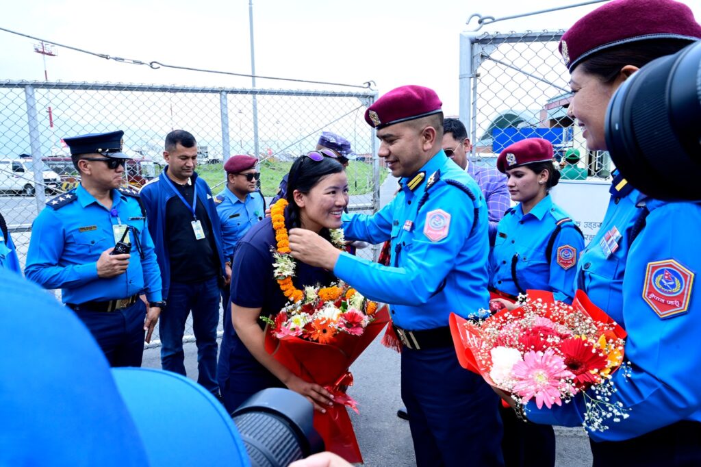 त्यतिमात्र नभएर सगरमाथाको सफलतापूर्वक आरोहण गरेकी पहिलो महिला प्रहरी असई शेर्पालाई बिहीबार भब्य स्वागत समेत गरिएको छ । प्रहरी संगठनको गौरव बढाउन सफल भएको भन्दै उनलाई त्रिभुवन अन्तर्राष्ट्रिय विमानस्थालमा स्वागत गरिएको हो ।