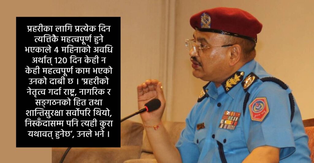 प्रहरीका लागि प्रत्येक दिन त्यत्तिकै महत्वपूर्ण हुने भएकाले ४ महिनाको अवधि अर्थात् १२० दिन केही न केही महत्वपूर्ण काम भएको उनको दाबी छ । ‘प्रहरीको नेतृत्व गर्दा राष्ट्र, नागरिक र सङ्गठनको हित तथा शान्तिसुरक्षा सर्वोपरि थियो, निस्कँदासम्म पनि त्यही कुरा यथावत् हुनेछ’, उनले भने ।