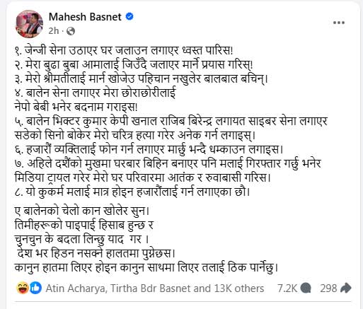 प्रतिशोधात्मक चेतावनीसमेत दिएका बस्नेतले आन्दोलनका क्रममा घरबार, प्रतिष्ठा र जीवनमाथि गम्भीर आक्रमण भएको बताएका छन्। जेन्जीले सेना उठाएर घर जलाउन लगाई ध्वस्त पारेको उनको आरोप छ।