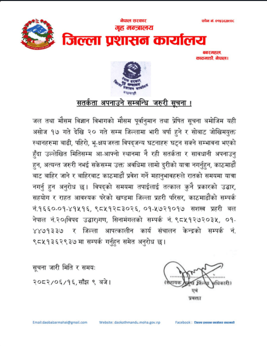 काठमाडौँ । जिल्ला प्रशासन कार्यालय काठमाडौँले असोज १७ गतेदेखि २० गतेसम्म भारी वर्षा हुने र सो बाट जोखिमयुक्त स्थानमा बाढी, पहिरो, भू–क्षयजस्ता विपदजन्य घटनाहरू हुन सक्ने भएकाले सतर्कता र सावधानी अपनाउन अनुरोध गरेको छ ।