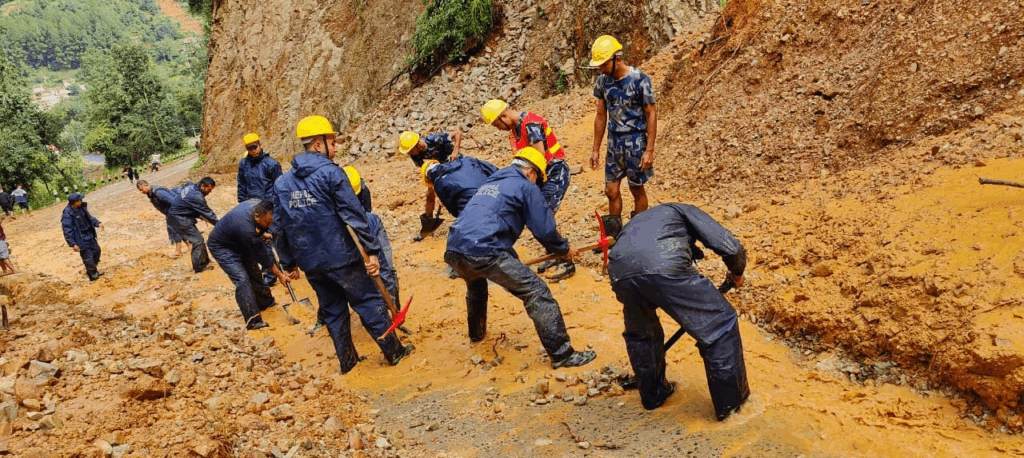 अविरल वर्षाको कारण ललितपुरको गोदावरी–५ खत्रीगाउँमा पहिरोले अवरुद्ध सडक खुलाउँदै गरेको दृश्यले प्रहरीको साहस झल्काउँछ । त्यस्तै, गोदावरी–१४ ठैबमा पहिरोमा परेकाहरूको उद्धार र जोखिममा रहेका स्थानीयलाई सुरक्षित स्थानमा लैजाँदा प्रहरीको मानवीयता फेरि चम्किन्छ ।