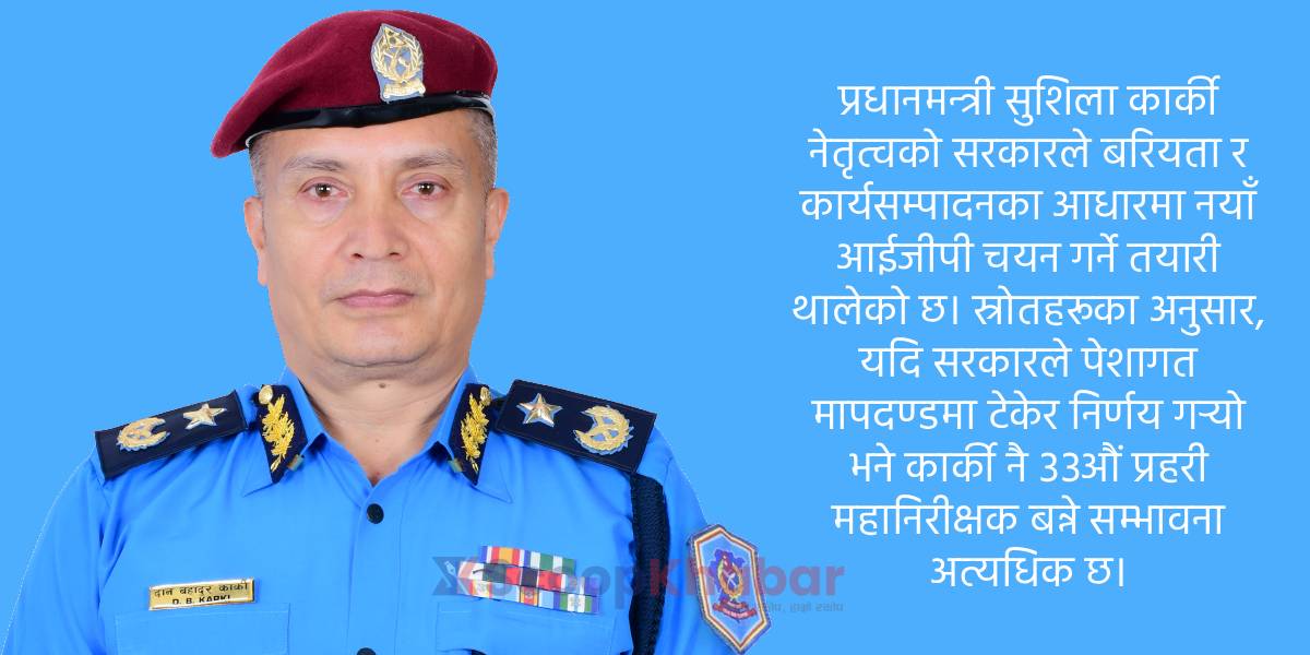 प्रधानमन्त्री सुशिला कार्की नेतृत्वको सरकारले बरियता र कार्यसम्पादनका आधारमा नयाँ आईजीपी चयन गर्ने तयारी थालेको छ। स्रोतहरूका अनुसार, यदि सरकारले पेशागत मापदण्डमा टेकेर निर्णय गर्यो भने कार्की नै ३३औं प्रहरी महानिरीक्षक बन्ने सम्भावना अत्यधिक छ।