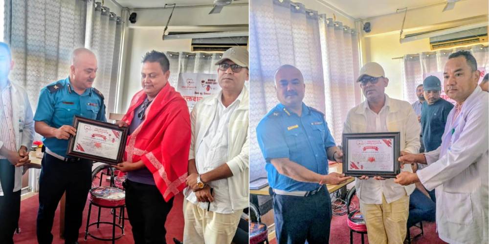 अस्पतालका प्रमुख तथा संचालक डा. सुभाष चौधरीले ६० पटक रक्तदान गरेका बालकृष्ण श्रेष्ठ, ४१ पटक गरेका सुबोध कोइराला, ४० पटक गरेका दिवाकर सापकोटा र रक्तदान अभियानका सक्रिय सहयोगी चन्द्रोदय साकोस र अध्यक्ष बसन्त आचार्यलाई टिका, माला र कदरपत्र प्रदान गरी सम्मान गरे।