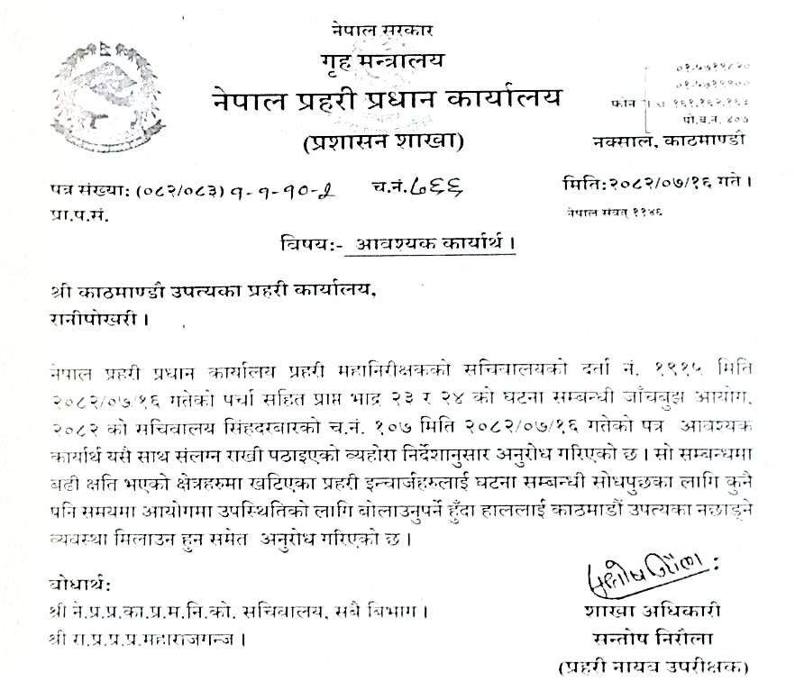 मुख्यालयले काठमाडौं उपत्यका प्रहरी कार्यालयलाई पत्राचार गर्दै त्यसताका सबैभन्दा बढी क्षति भएको क्षेत्रहरूमा खटिएका इन्चार्जलाई कुनै पनि बेला आयोगमा सोधपुछका लागि बोलाउनुपर्ने भएकाले बाहिर नजाने व्यवस्था मिलाउन भनेको हो ।