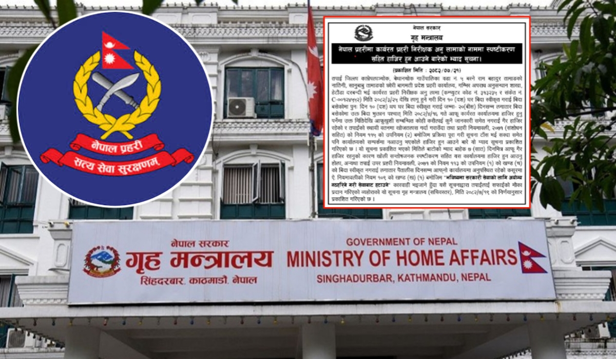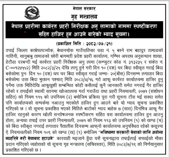 सूचनामा भनिएको छ ‘सात दिनभित्र कार्यालयमा हाजिर नभई सन्तोषजनक स्पष्टीकरण नदिएमा, प्रहरी नियमावली २०७१ को नियम ११३(१)(च) र नियम १०९(ख)(१) बमोजिम, बिना बिदा लगातार ४५ दिन अनुपस्थित भएको कसूरमा सेवाबाट हटाइनेछ।’