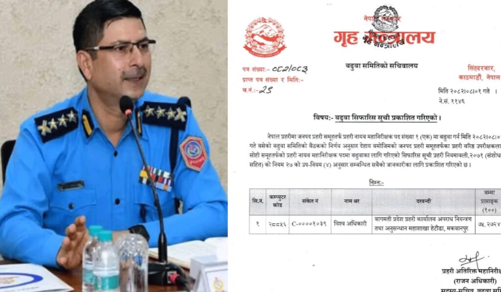 काठमाडौँ । लामो समयदेखि बढुवाबाट वञ्चित एसएसपी विश्व अधिकारीलाई अखेर न्याय मिलेको छ। आज बसेको प्रहरी बढुवा समितिको बैठकले अधिकारीलाई डिआइजी (DIG) पदका लागि सिफारिस गरेपछि प्रहरी संगठनभित्र ठूलो राहत र खुशी छाएको छ।