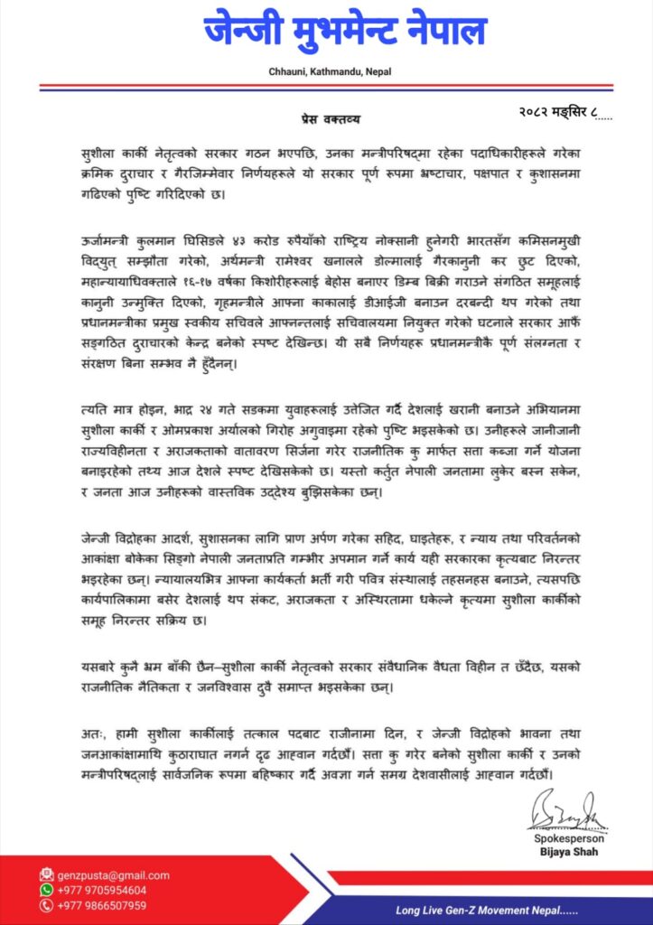 ‘अतः हामी सुशीला कार्कीलाई तत्काल पदबाट राजीनामा दिन र जेनजी विद्रोहको भावना तथा जनआकांक्षामाथि कुठराघात नगर्न आह्वान गर्दछौँ’, जनेजी मुभमेन्टले सोमबार जारी गरेको विज्ञप्तिमा भनिएको छ, ‘सत्ता ‘कु’ गरेर बनेको सुशीला कार्की र उनको मन्त्रिपरिषदलाई सार्वजनिक रूपमा बहिस्कार गर्दै अवज्ञा गर्न समग्र देशवासीलाई आहन गर्दछौँ ।’