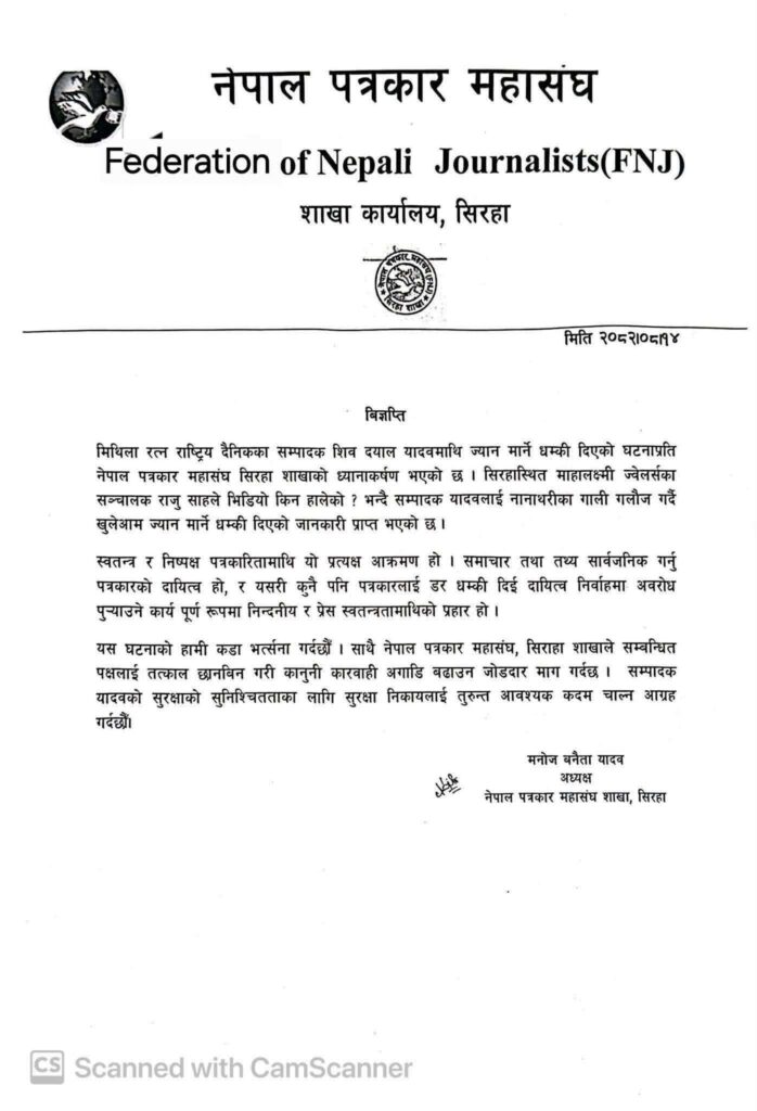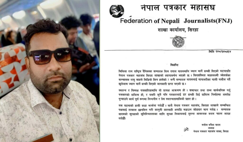 सिरहा। नेपाल पत्रकार महासंघ सिरहाका निवर्तमान सचिव, मिथिला रत्न रास्ट्रिय दैनिकका संचालक तथा एभिन्युज टिभीका सिरहा सम्बाददाता शिवदयाल यादवमाथि खुलेआम ज्यान मार्ने धम्की दिइएको घटनाले स्थानीय पत्रकारिता जगत आक्रोशित बनेको छ।