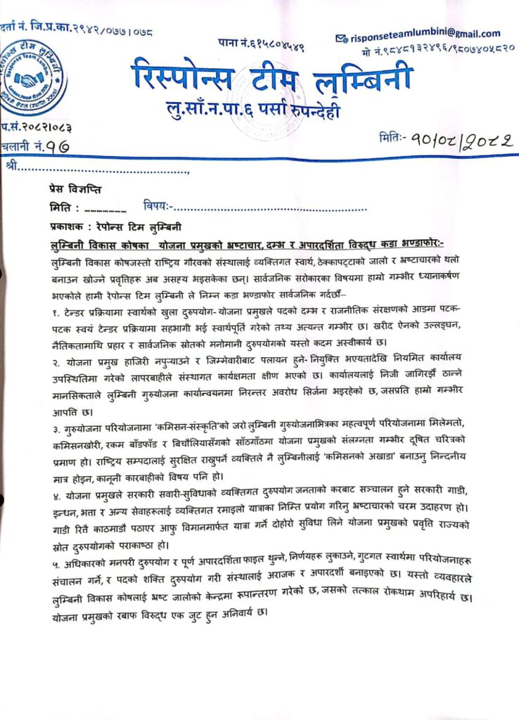 काठमाडौं । लुम्बिनी विकास कोषभित्र बढ्दै गएको भ्रष्टाचार, दम्भ र अपारदर्शिताविरुद्ध ‘रेपोन्स टिम लुम्बिनी’ले कडा भण्डाफोर गर्दै योजना प्रमुख स्मिता भट्टमाथि गम्भीर अनियमितताका आरोप सार्वजनिक गरेको छ।