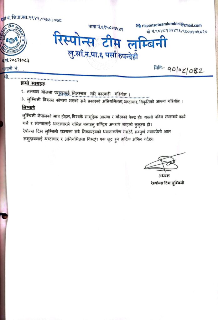 यी गतिविधिमाथि तत्काल कारबाही माग गर्न ‘रेपोन्स टिम लुम्बिनी’ले आग्रह गर्दै एक साता अगाडि ज्ञापन पत्र बुझाएको जनाएको हो ।